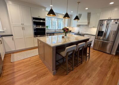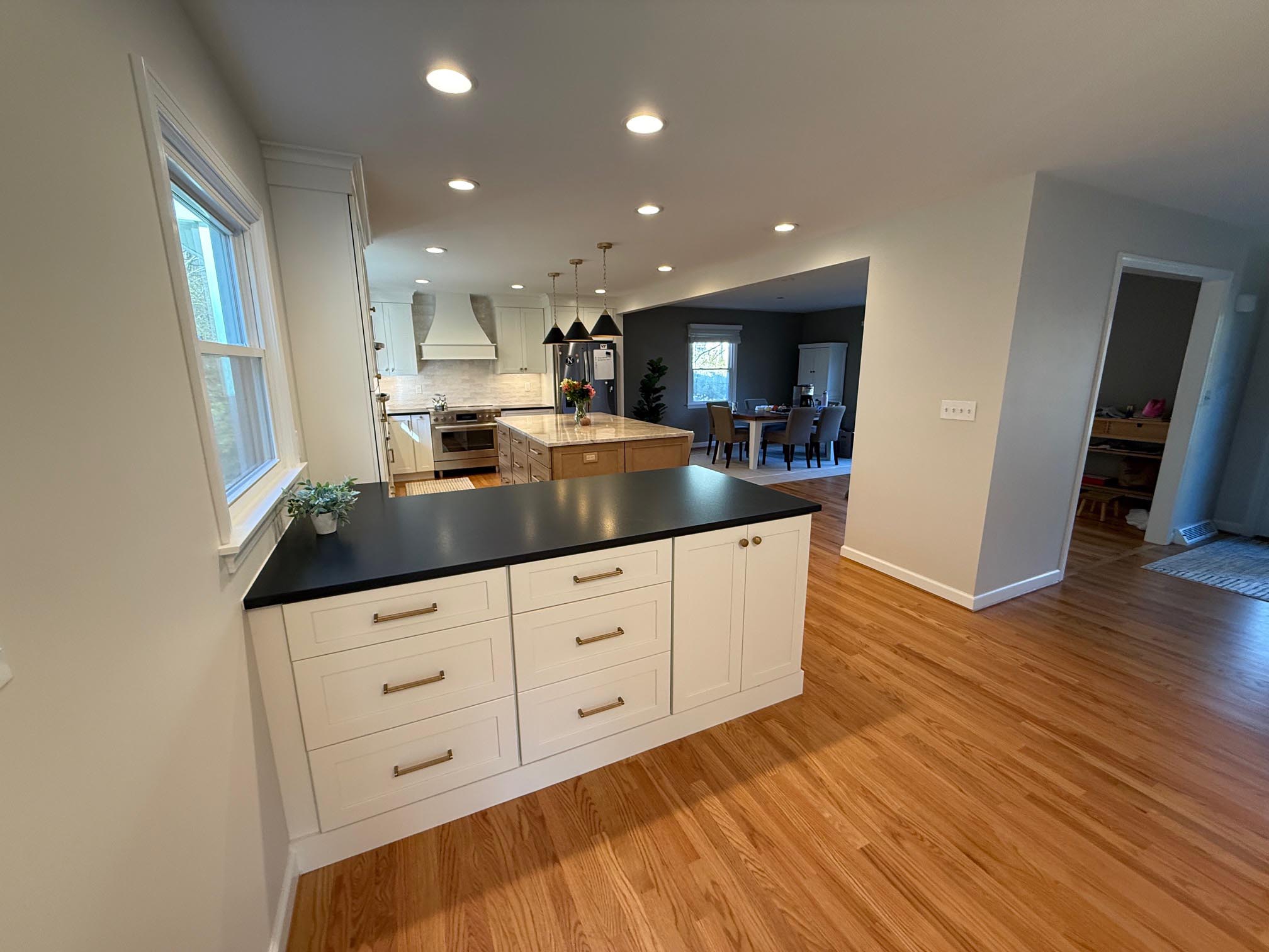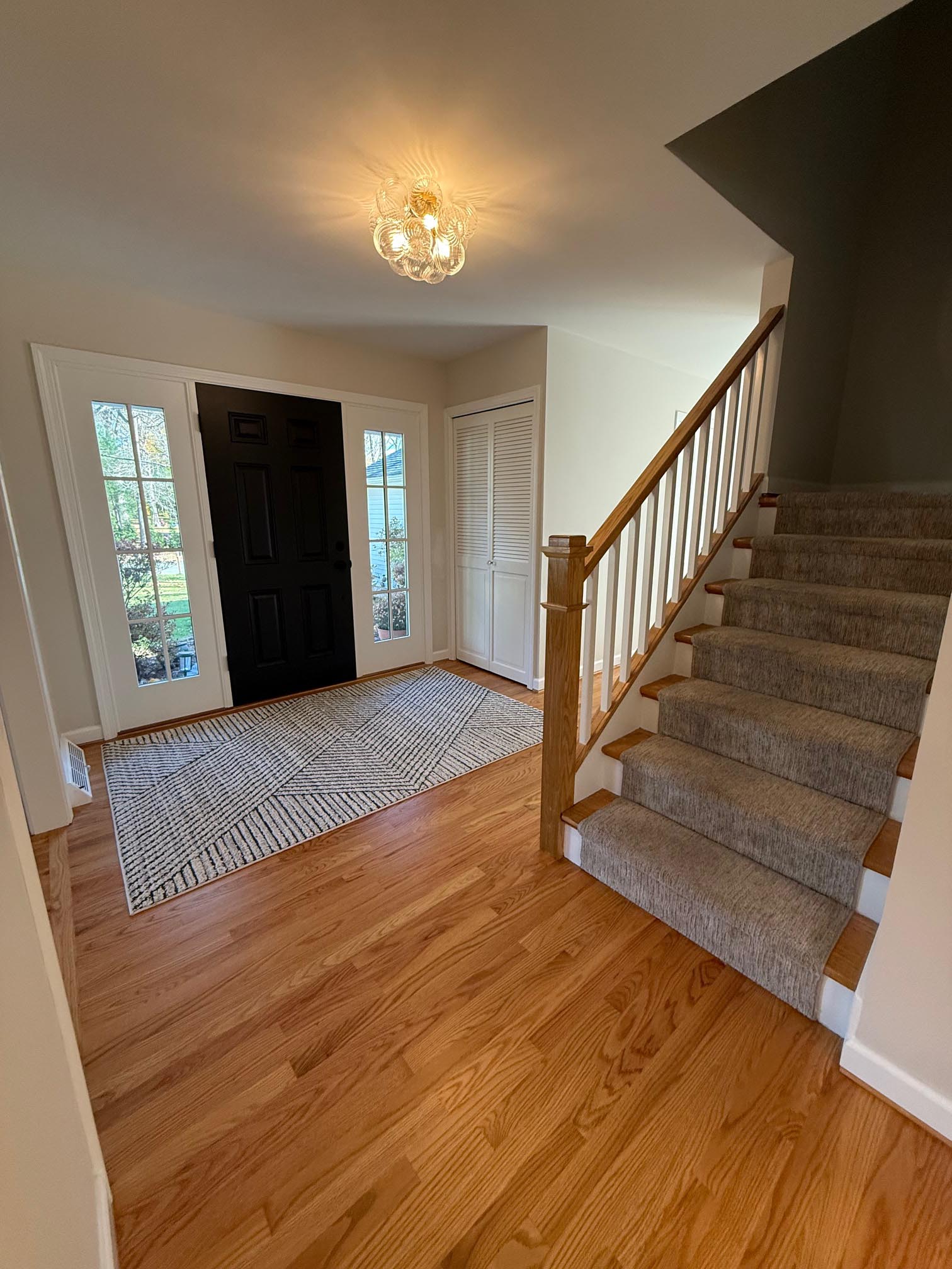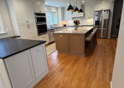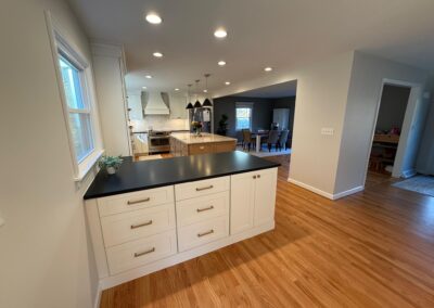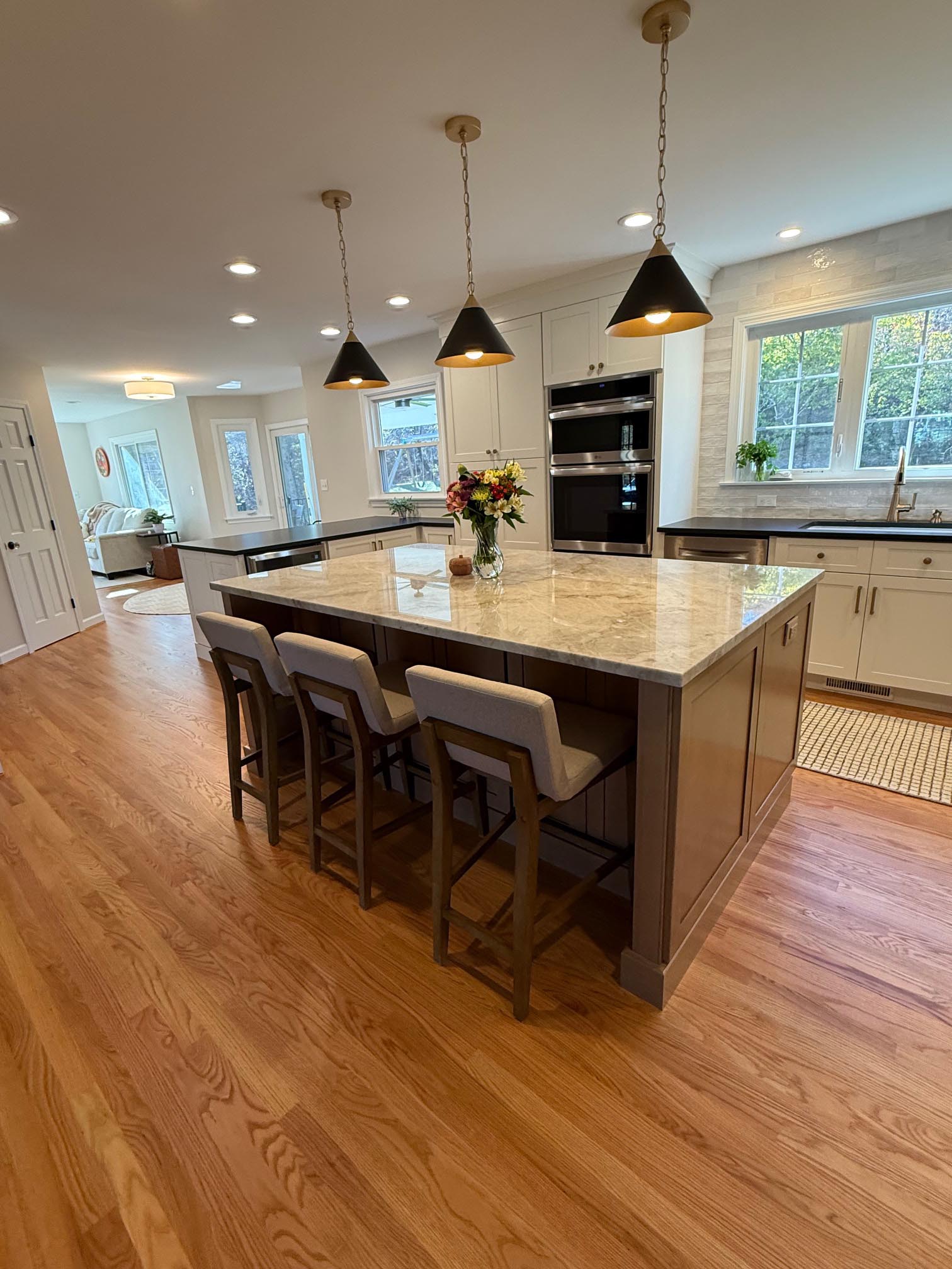 Inside the home, we transformed the existing kitchen, dining room, and living room layout into one large, open-concept great room. The new design allowed the kitchen to expand into the former dining area, making room for a large island and peninsula. We refinished all the hardwood floors on the main level, added a walk-in pantry, rebuilt the stairs and railing, installed a new front door with two sidelights, and fully renovated the first-floor half bathroom. We also updated electrical and lighting throughout and completed the project with a fresh coat of paint.