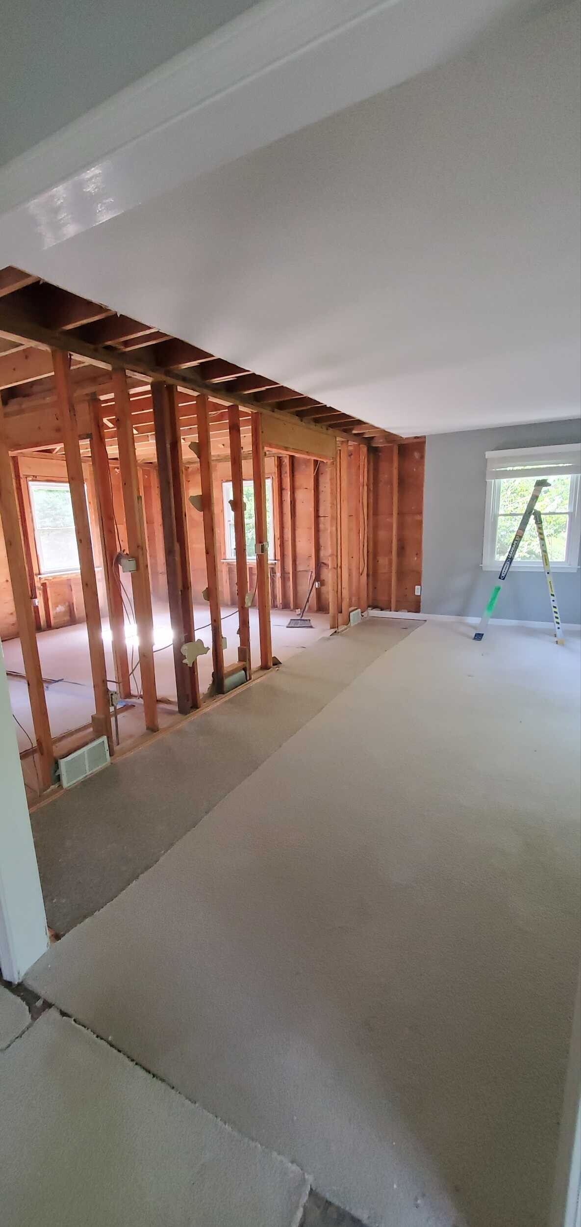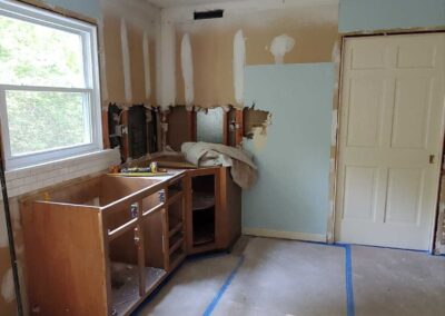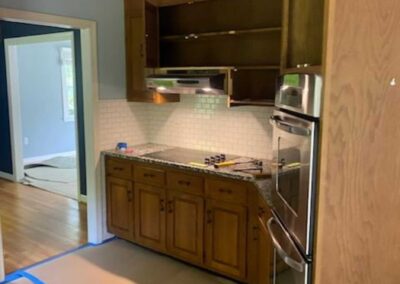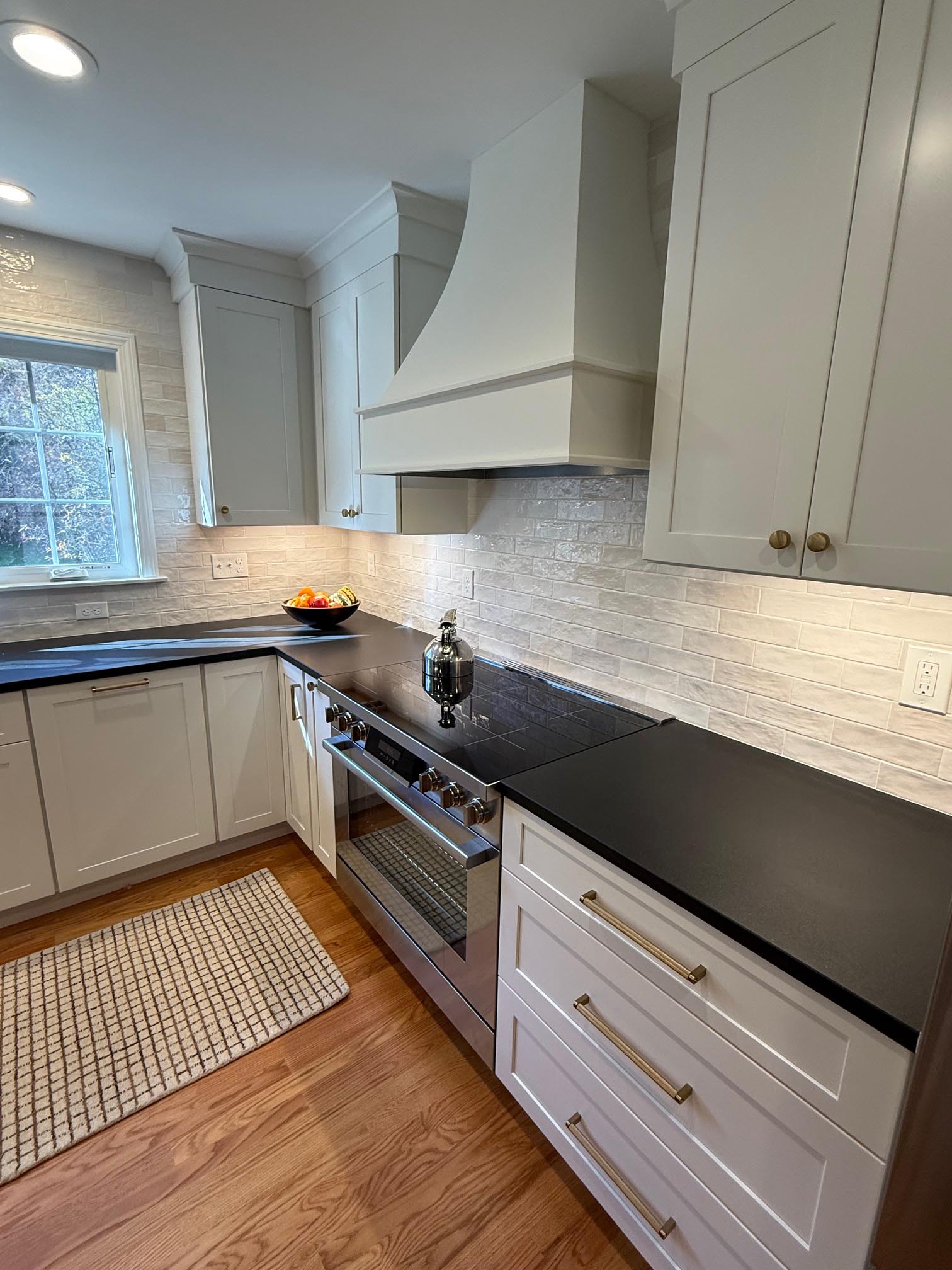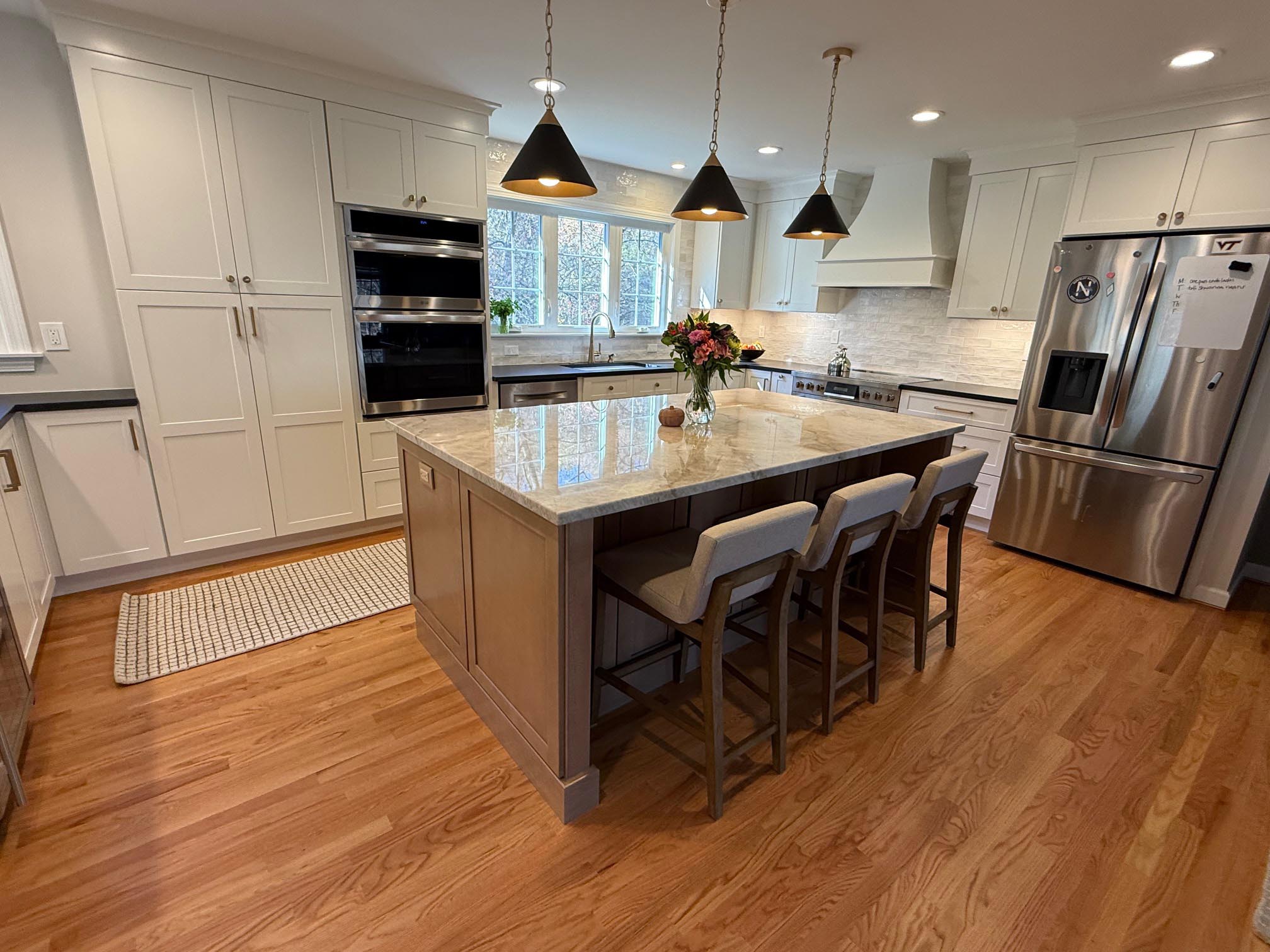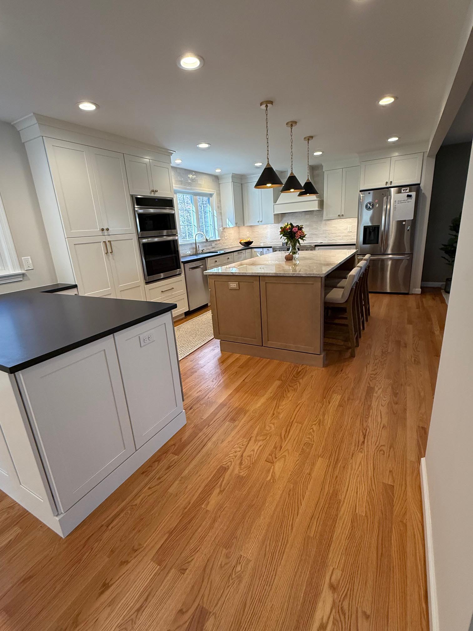 Inside the home, we transformed the existing kitchen, dining room, and living room layout into one large, open-concept great room. The new design allowed the kitchen to expand into the former dining area, making room for a large island and peninsula. We refinished all the hardwood floors on the main level, added a walk-in pantry, rebuilt the stairs and railing, installed a new front door with two sidelights, and fully renovated the first-floor half bathroom. We also updated electrical and lighting throughout and completed the project with a fresh coat of paint.