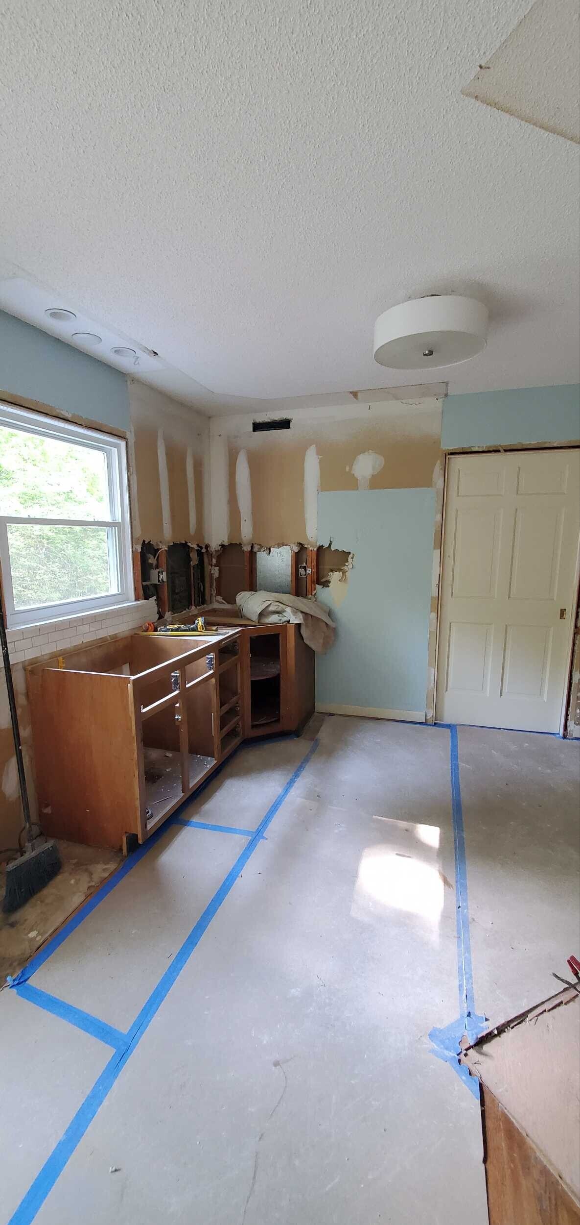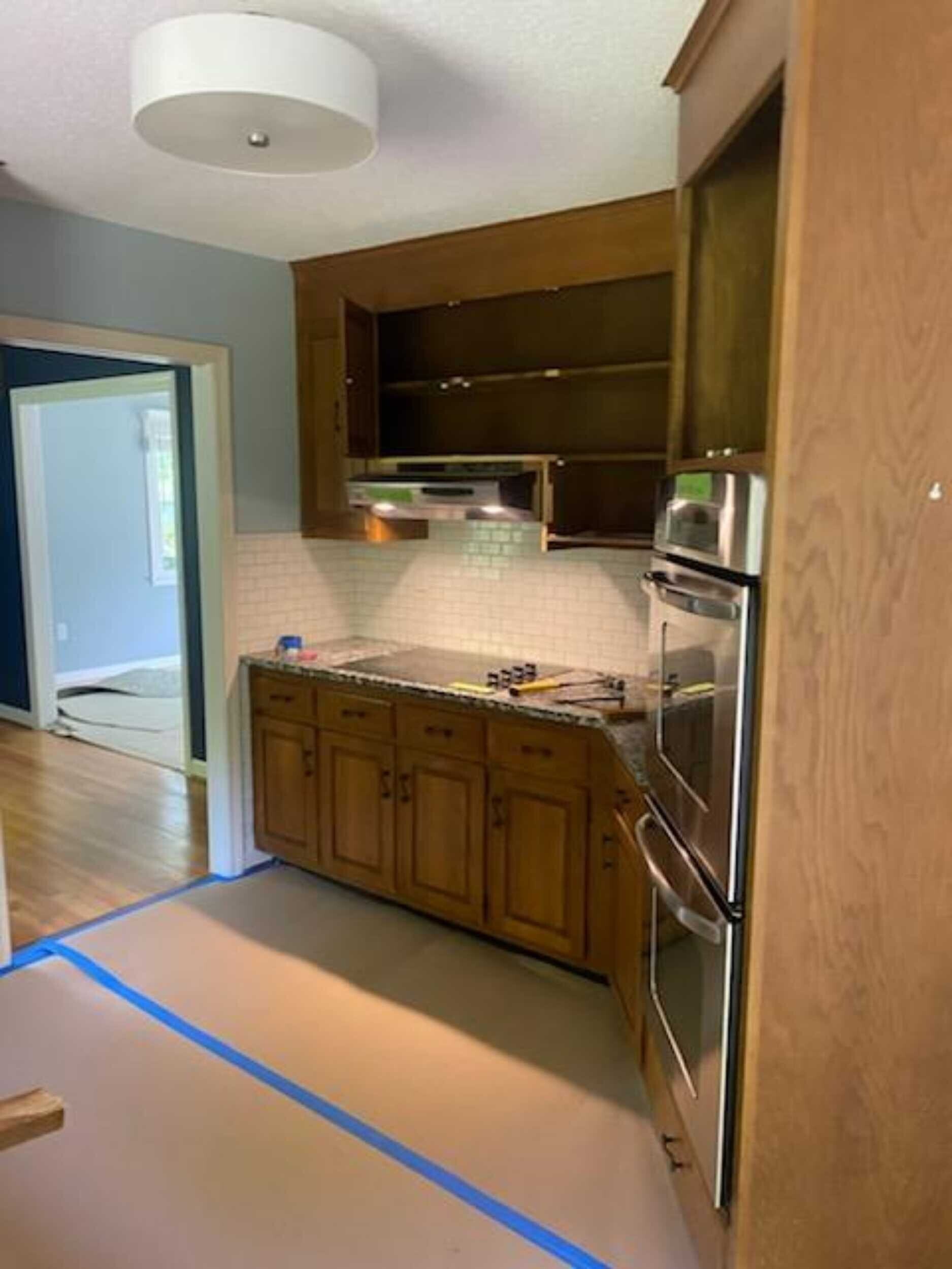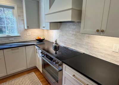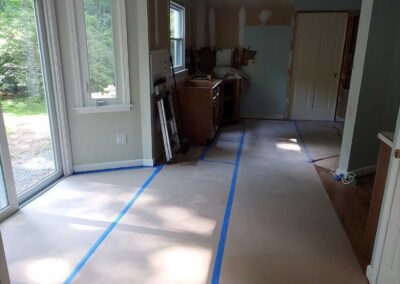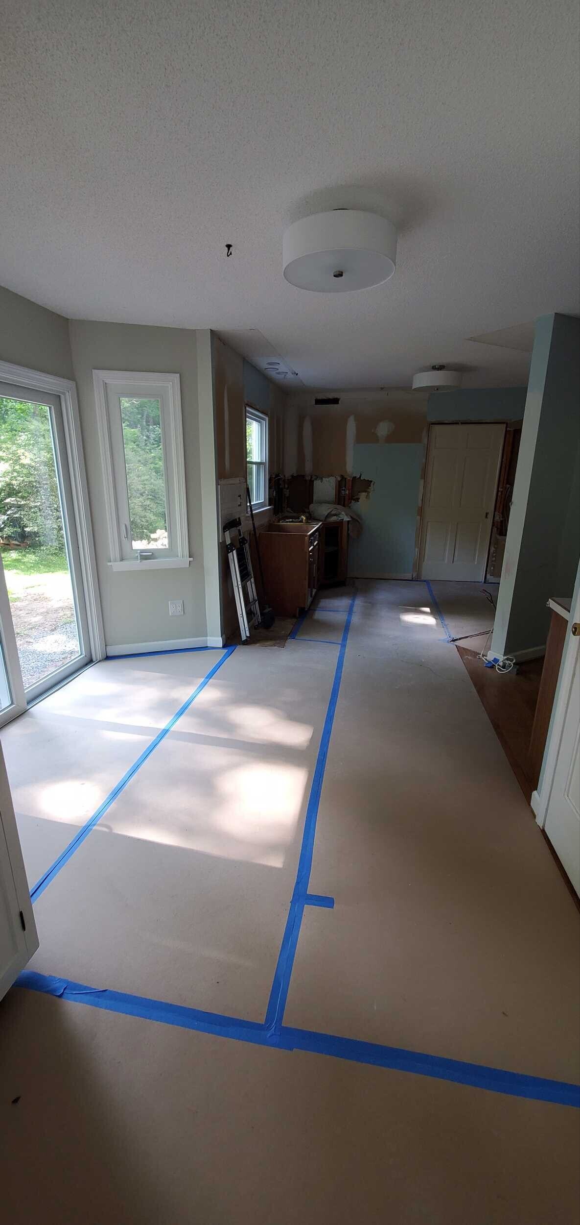 Inside the home, we transformed the existing kitchen, dining room, and living room layout into one large, open-concept great room. The new design allowed the kitchen to expand into the former dining area, making room for a large island and peninsula. We refinished all the hardwood floors on the main level, added a walk-in pantry, rebuilt the stairs and railing, installed a new front door with two sidelights, and fully renovated the first-floor half bathroom. We also updated electrical and lighting throughout and completed the project with a fresh coat of paint.